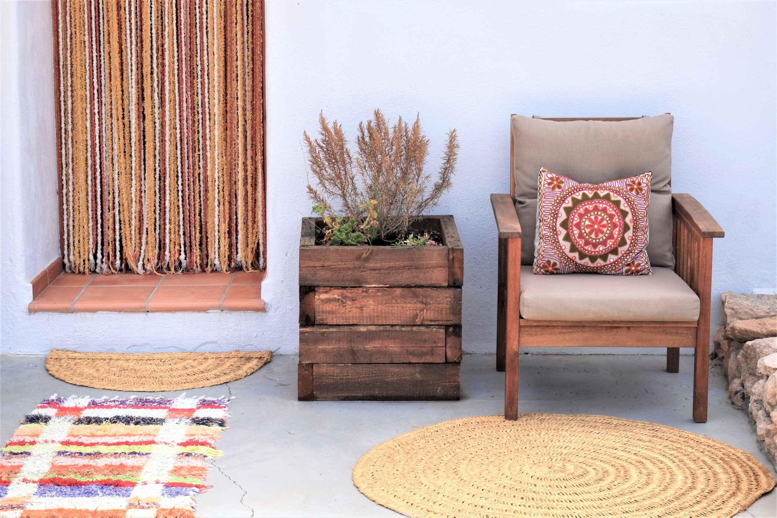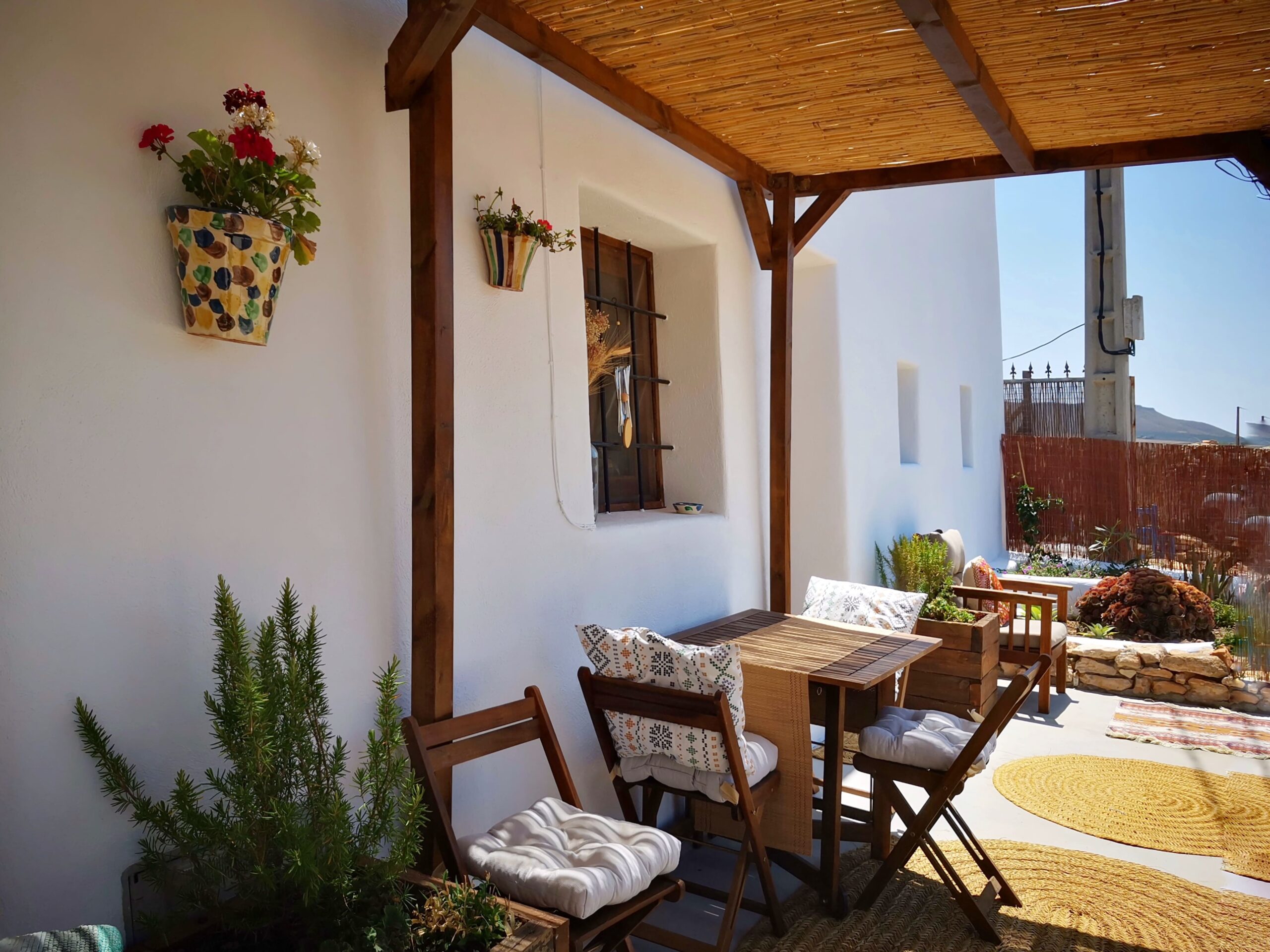 Apartamento luminoso con un amplio salón con techos altos, comedor con cocina americana, dormitorio y baño. Tiene una terraza exterior privada con un conjunto de jardín para relajarse y contemplar las fantásticas puestas de sol del Cabo de Gata.